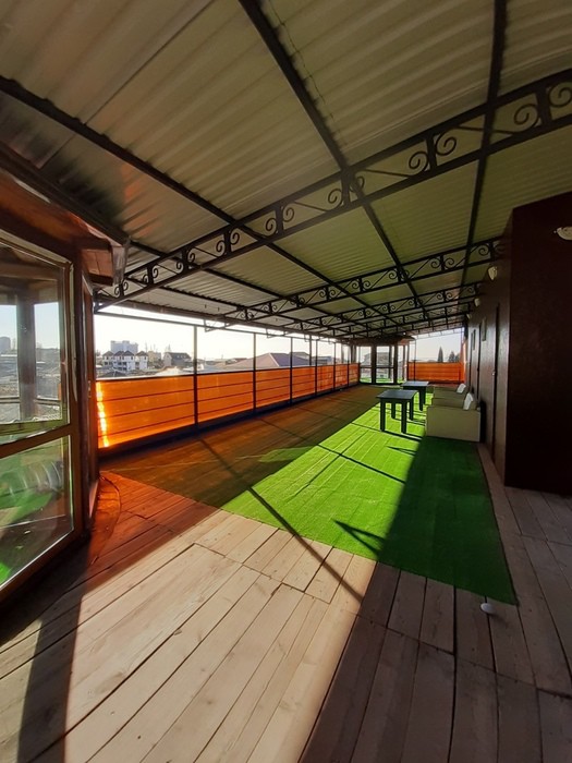 На нижнем этаже находится бар и ресторан с кальяном, где заказывают завтрак, обед и ужин. На крыше отеля находится открытый бассейн и сауна. Отсюда раскрываются великолепные виды на горы, лес и море.