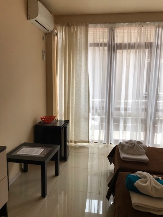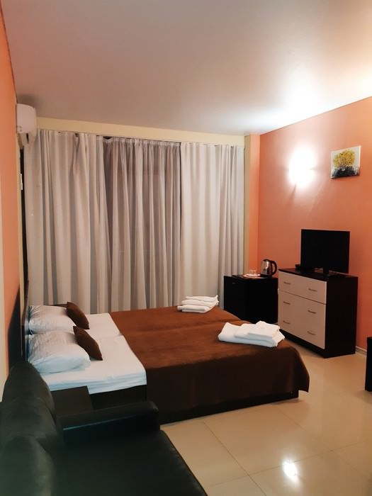 Площадь номера - 18-20 кв.м. 1 комната. 2 осн. места. В номере: холодильник; кондиционер; спутниковое телевидение; душ; фен; 1-спальные кровати; балкон (в части номеров); диван; чайник; санузел; теплый пол. 1 доп. место: